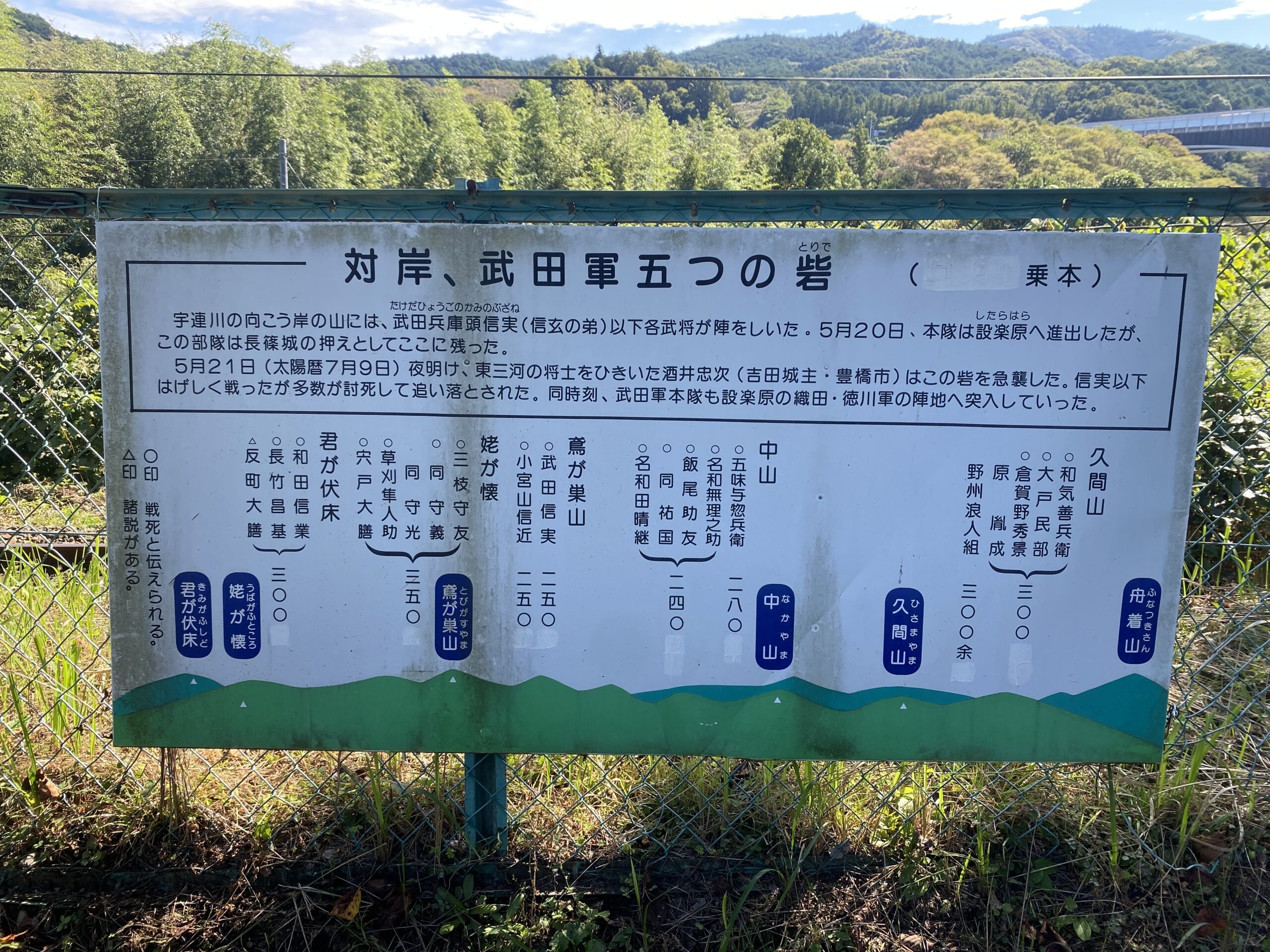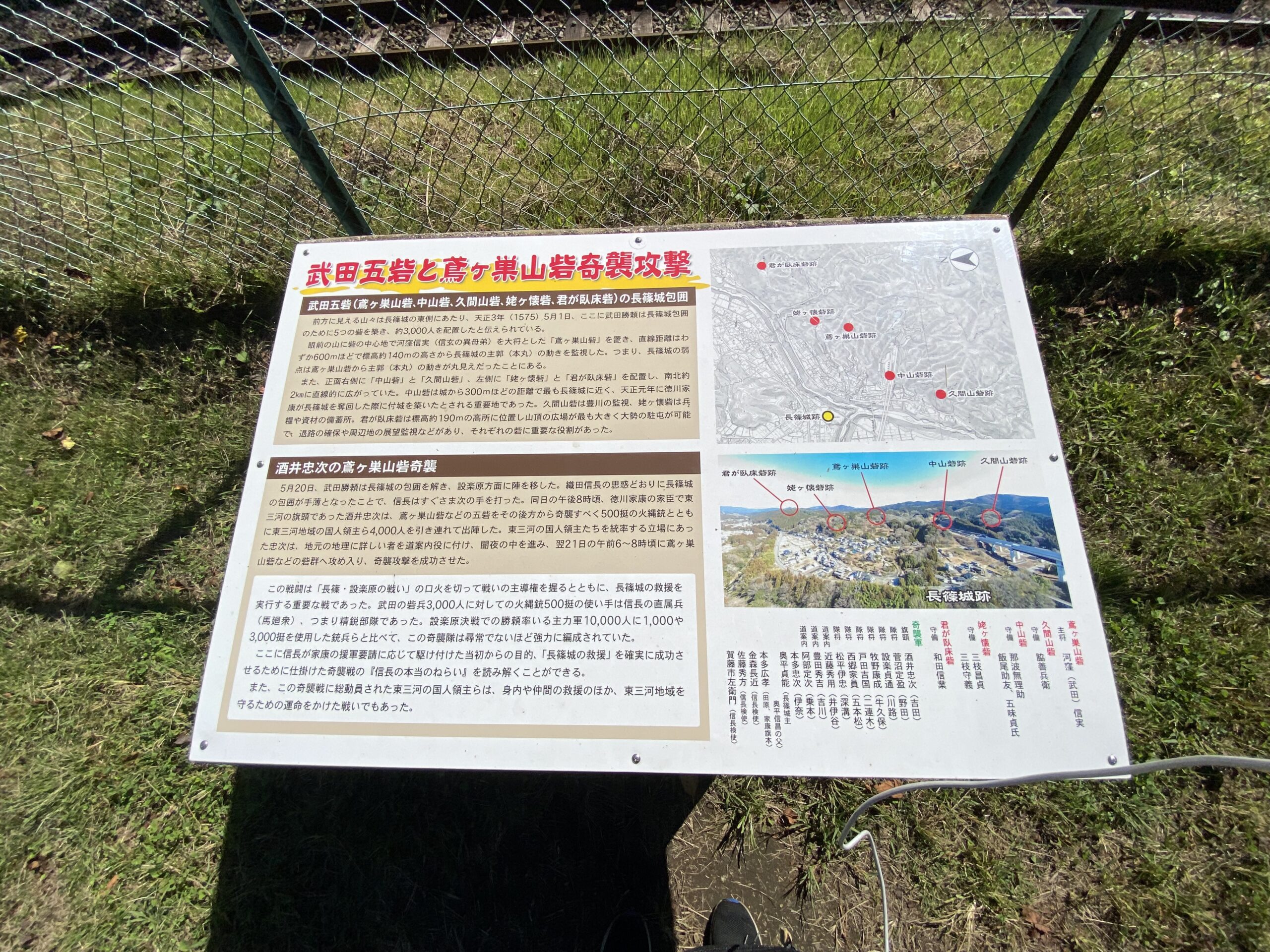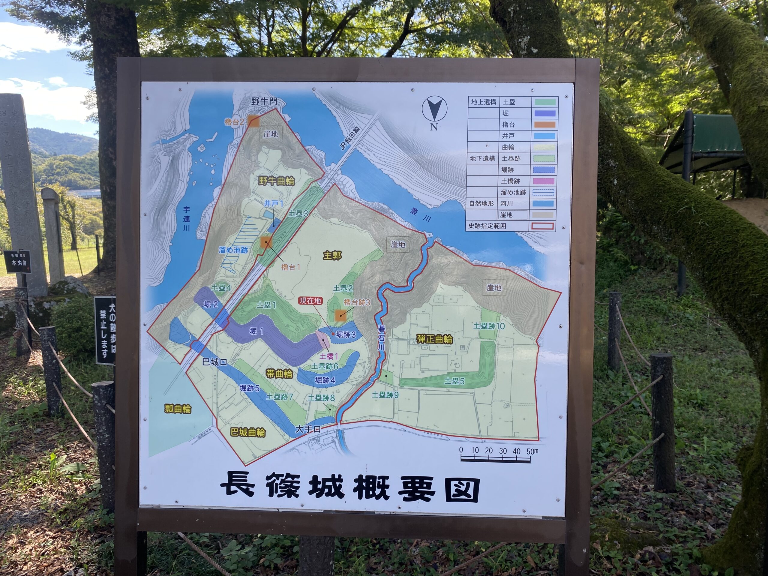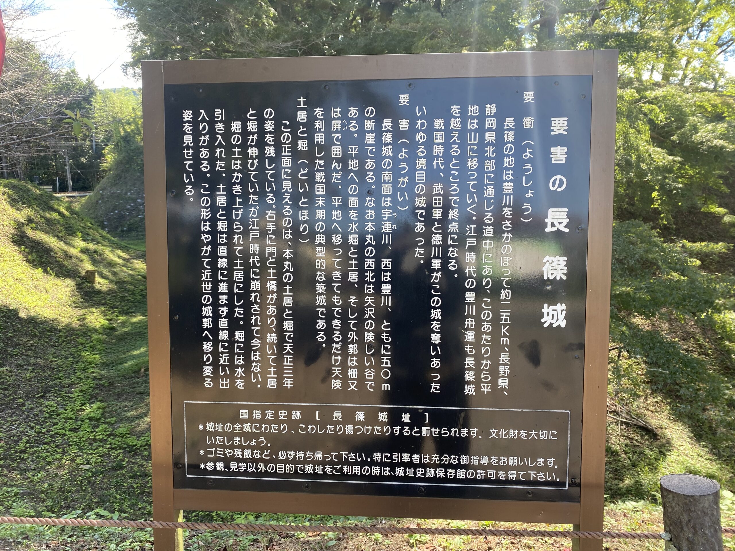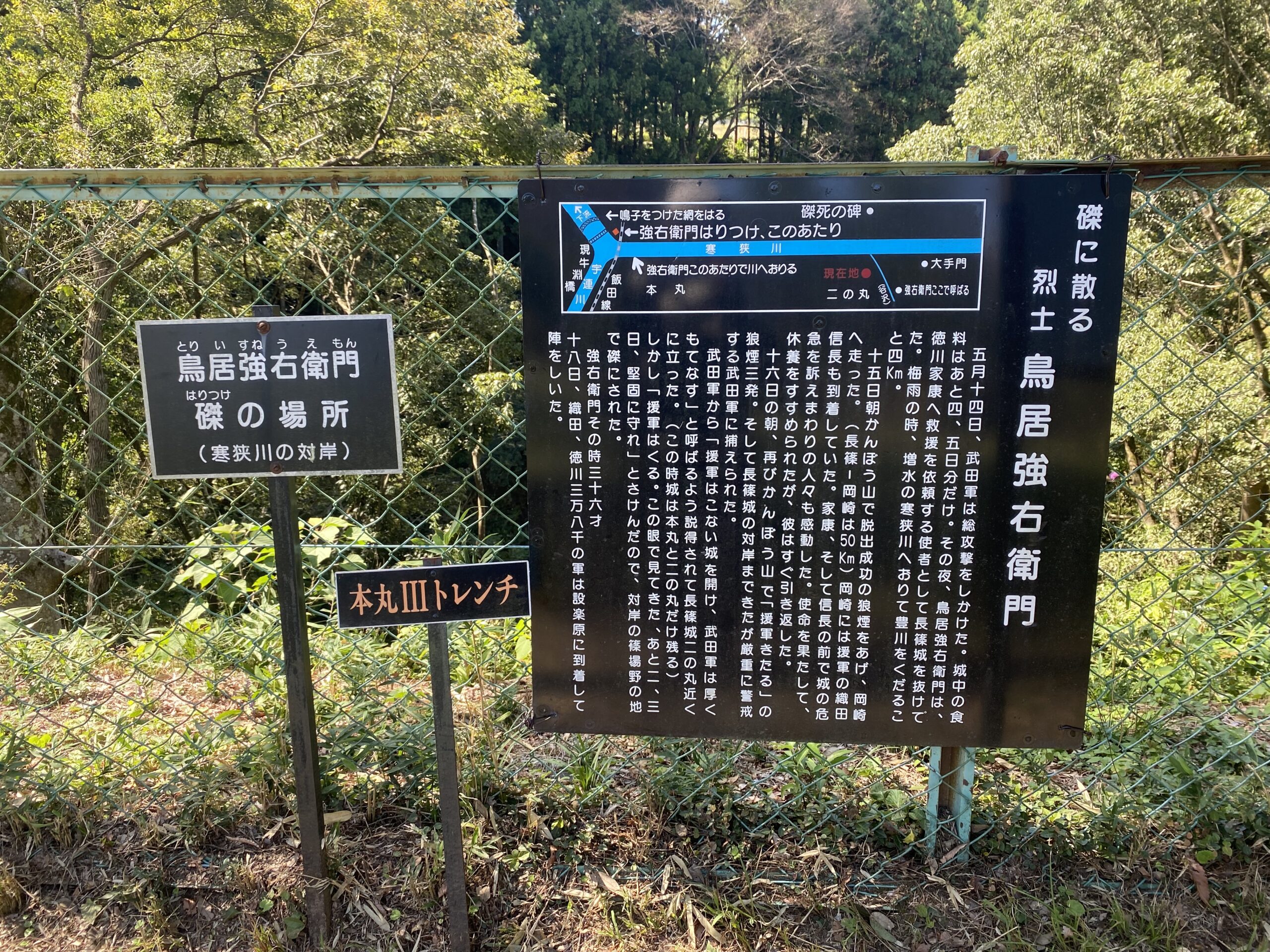 本丸の周囲にはフェンスが設けられており、各所に歴史案内板や解説板が設置されています。これらを読みながら歩くことで、長篠城の役割や当時の戦いの様子を具体的にイメージしやすくなっています。