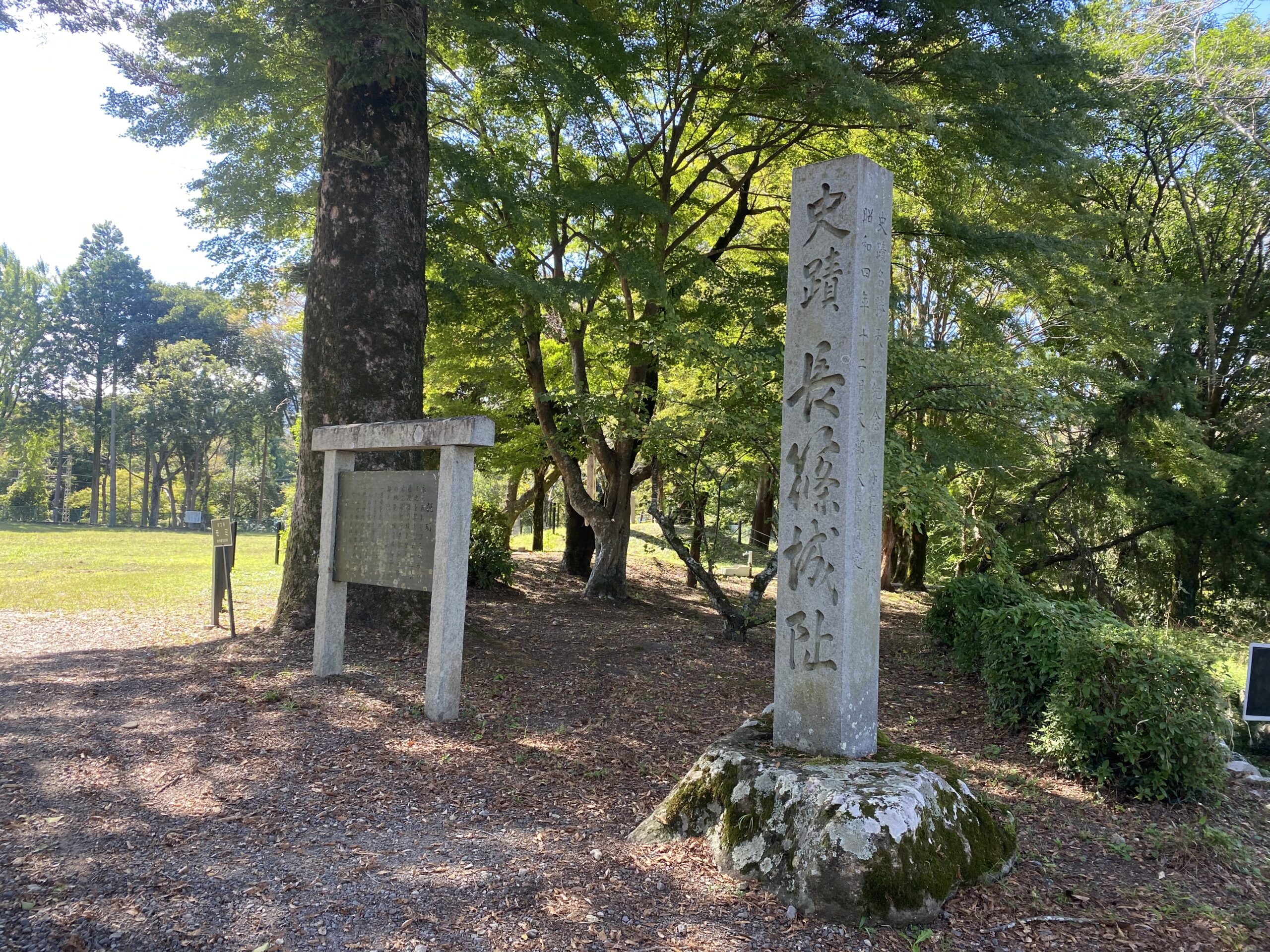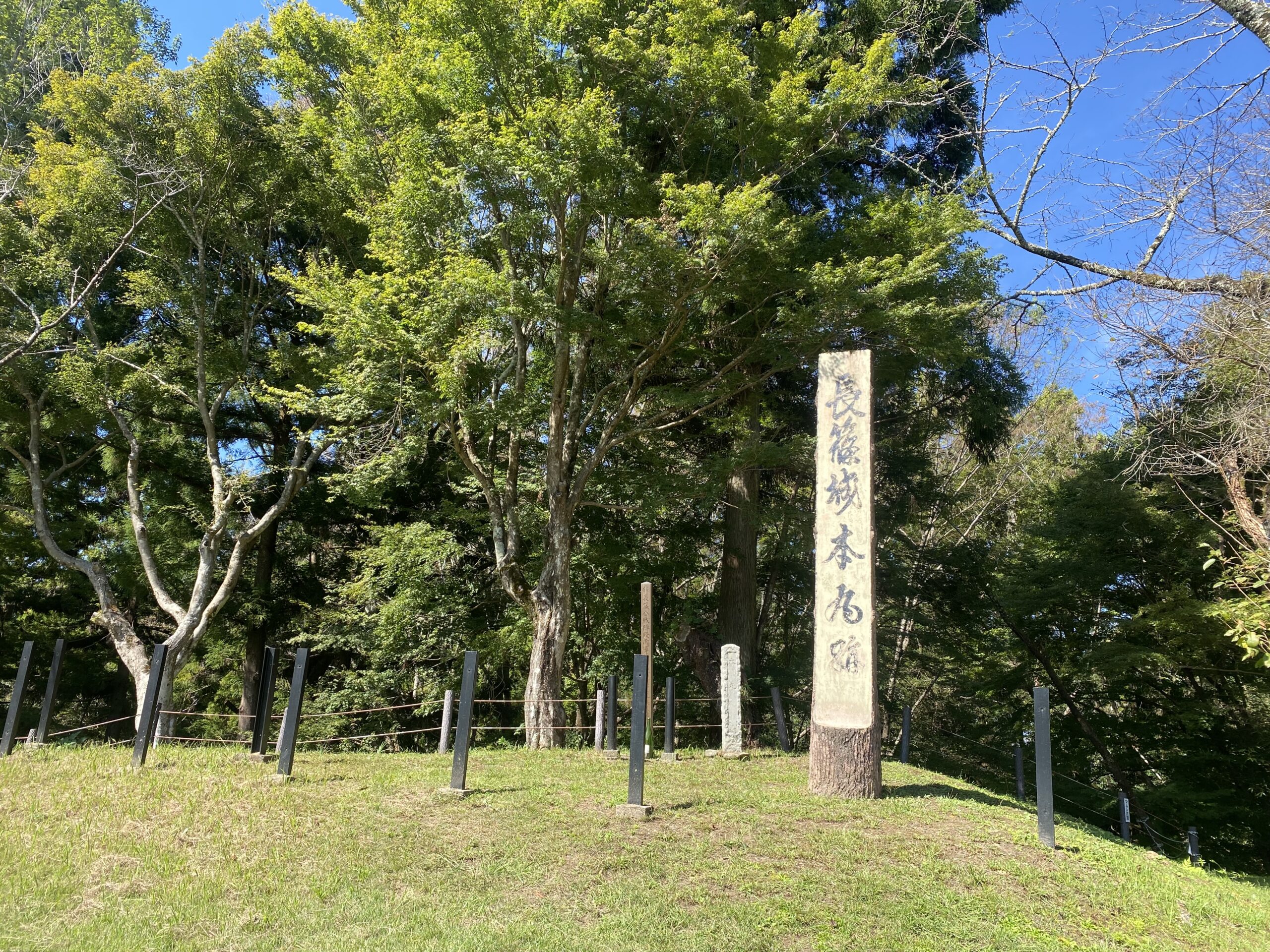 土橋を渡った先に広がる本丸広場は、訪れた10月には青々とした草に覆われ、広場の隅には長篠城跡の石碑が静かに佇んでいました。