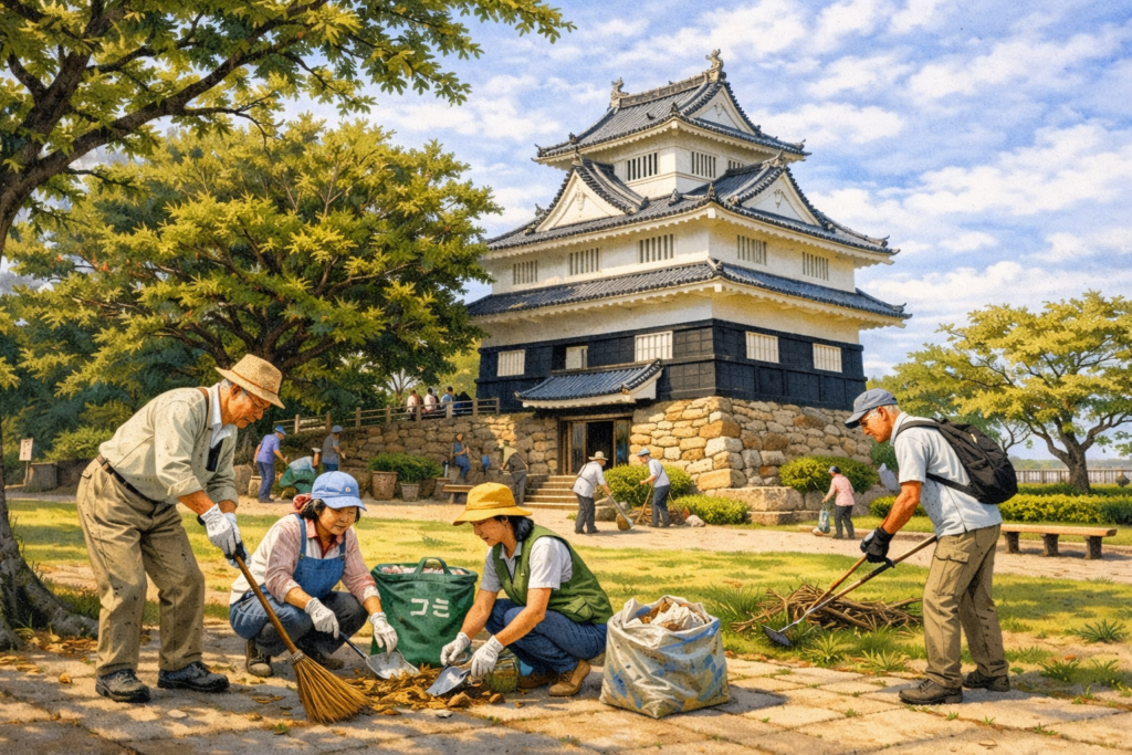 芝生の広場では家族連れがくつろぎ、歴史好きの人々は石垣や城跡を見ながら戦国時代の物語に思いを巡らせています。