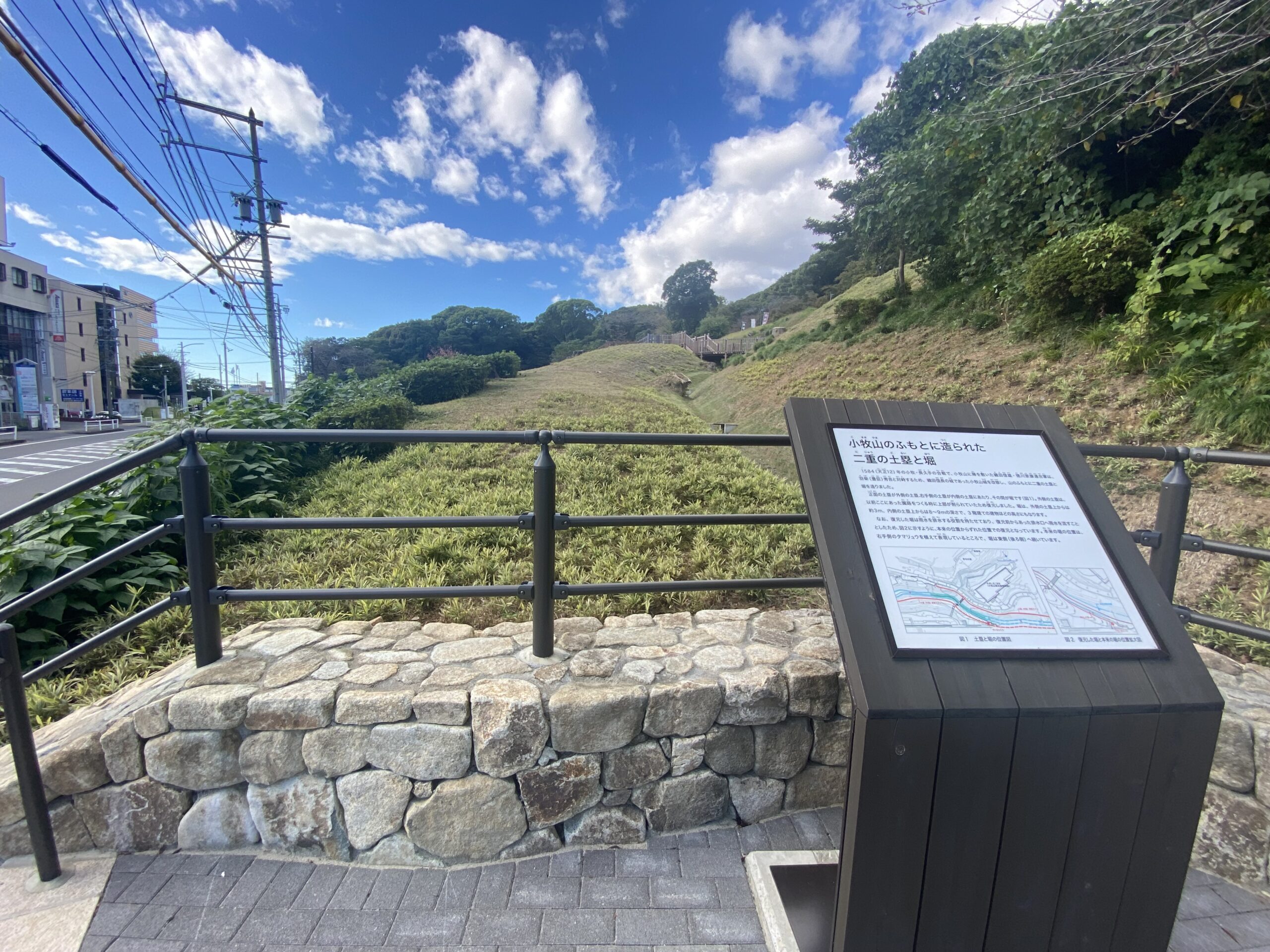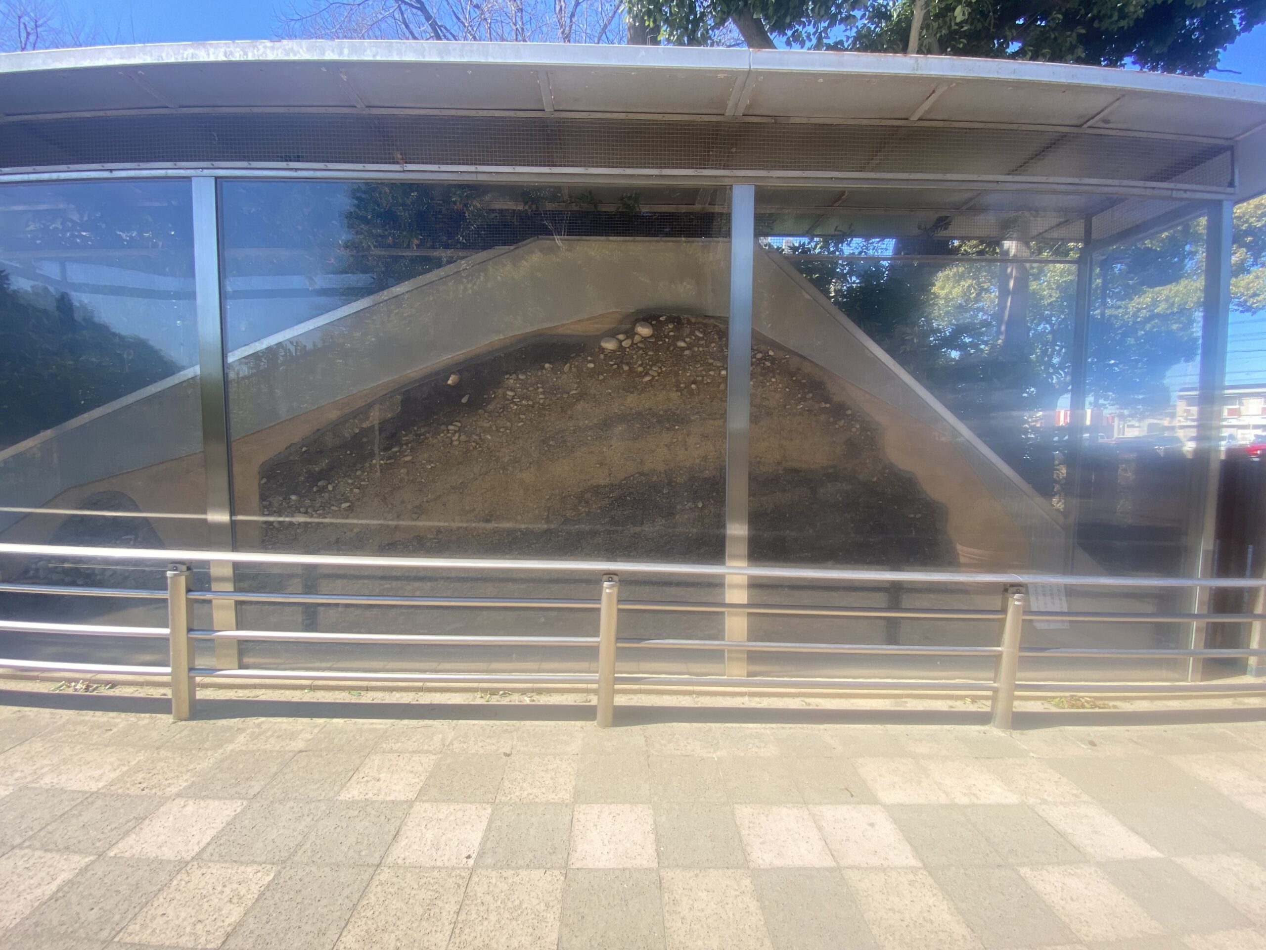 さらに、公園北東側には土塁の断面をそのまま展示した施設があり、土が何層にも積み重ねられている構造を観察できます。